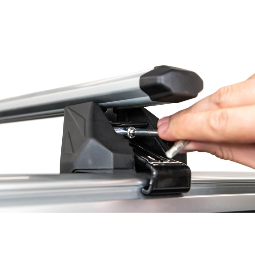 Un caoutchouc antidérapant est appliqué sur la partie supérieure des barres de toit en aluminium afin d'éviter que la charge ne se déplace le long de la galerie de toit de la voiture. Chaque système est équipé d'une serrure qui empêche le vol.