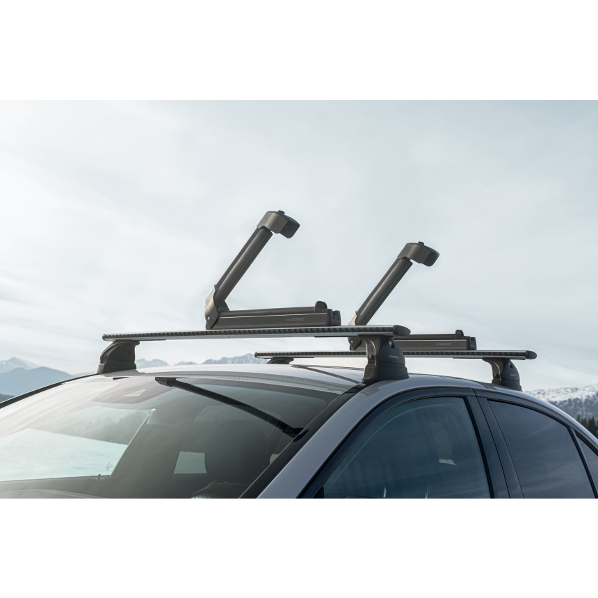 Le porte-skis KING EVO 40 peut accueillir deux snowboards ou quatre paires de skis. Ils sont fabriqués en aluminium résistant aux chocs et de qualité supérieure, et l'intérieur est isolé avec du caoutchouc pour protéger vos skis. Un système antivol est également intégré aux porte-skis.